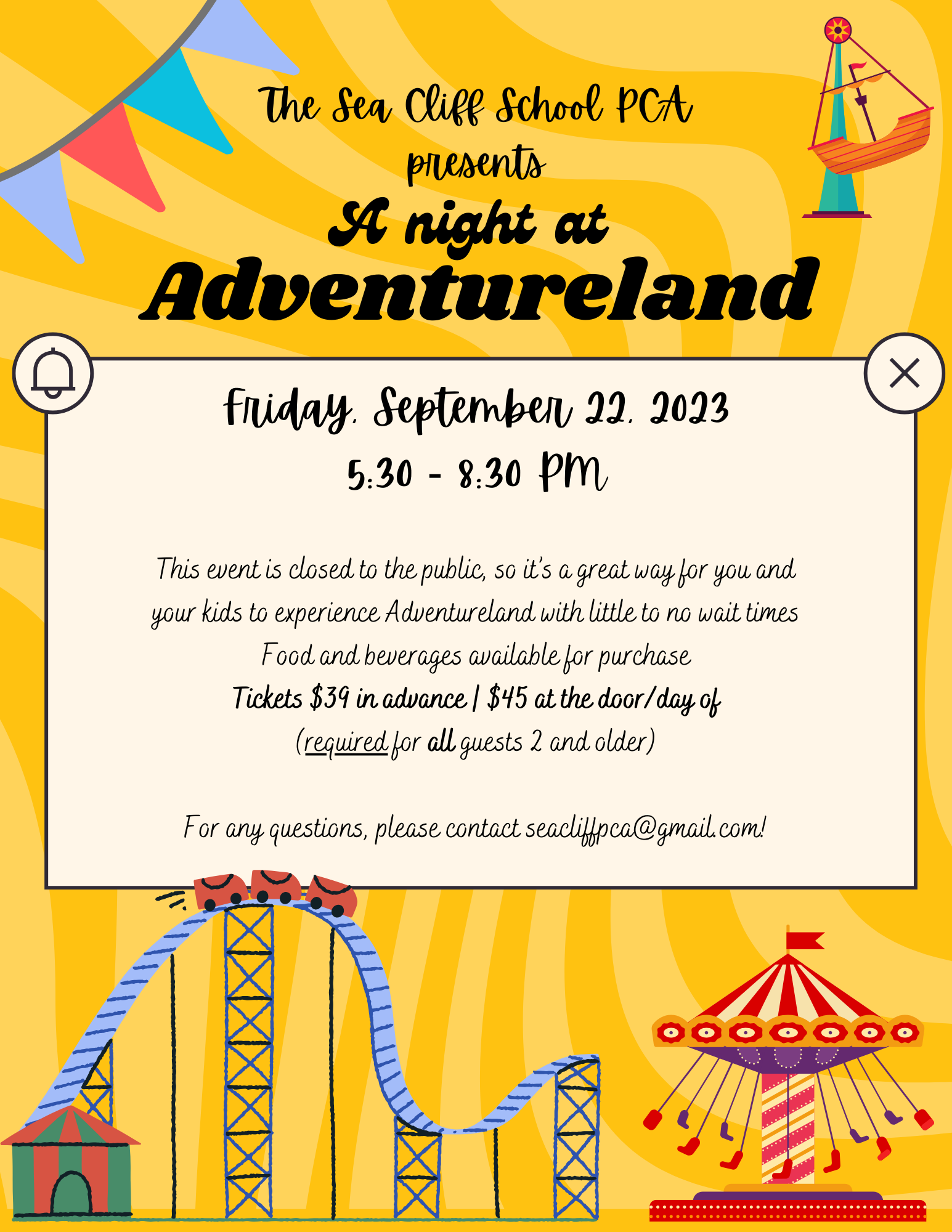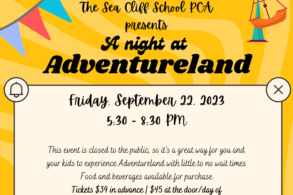 This event is also a fundraiser for the PCA, to help our efforts to provide many (free) other events throughout the school year. For any questions or concerns please contact seacliffpca@gmail.com. We hope to see you there!