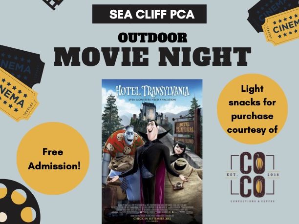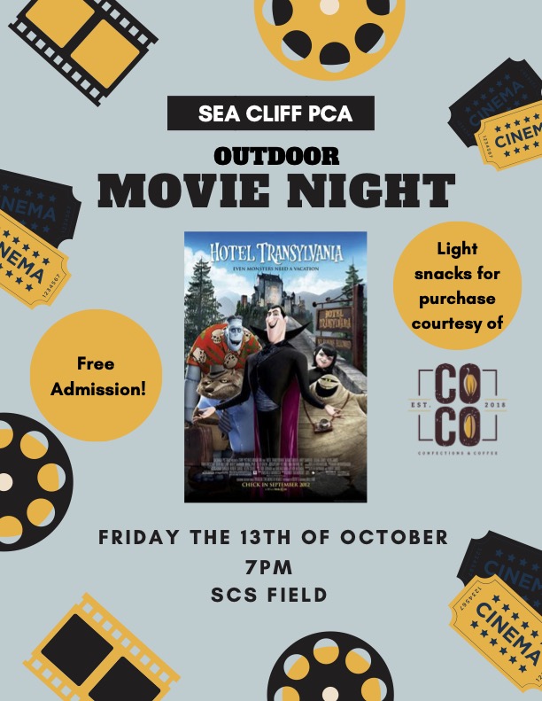 Join us for our Annual Outdoor Movie night on Friday the 13th at 7 PM on Sea Cliff School Field. Light snacks will be on hand for purchase from local favorite Coco Confections and Coffee. This event is rain or shine. In the event of inclement weather we will move into the auditorium. See you there!
