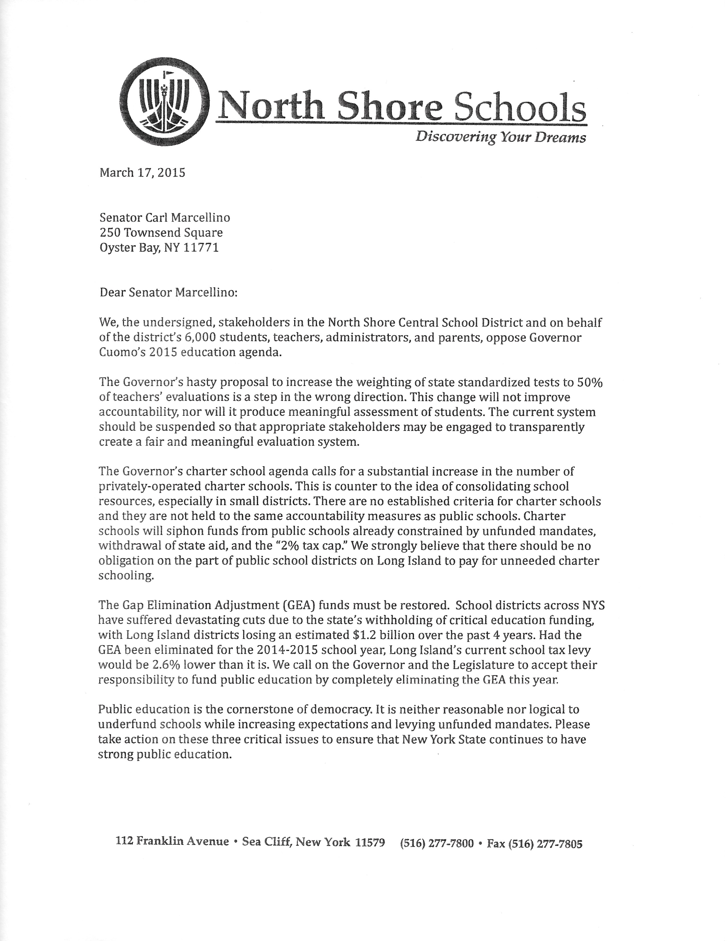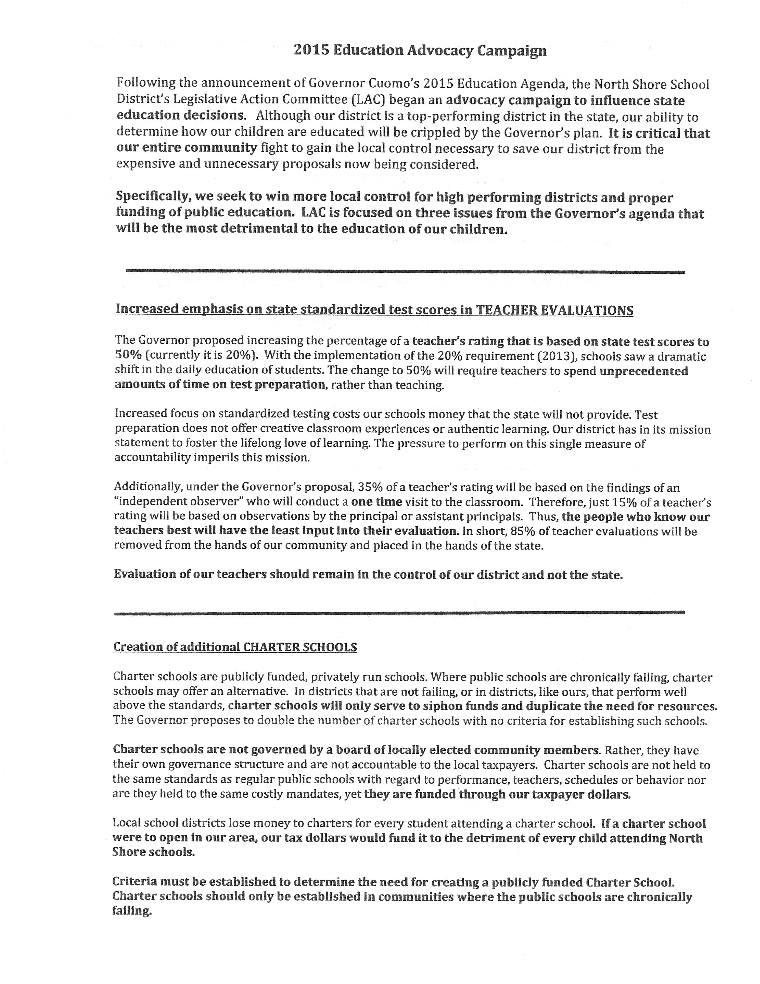 - 2 handouts (included)- Letter to Marcellino to oppose Governor Cuomo’s 2015 education agenda and 2015 Education Advocacy Campaign.